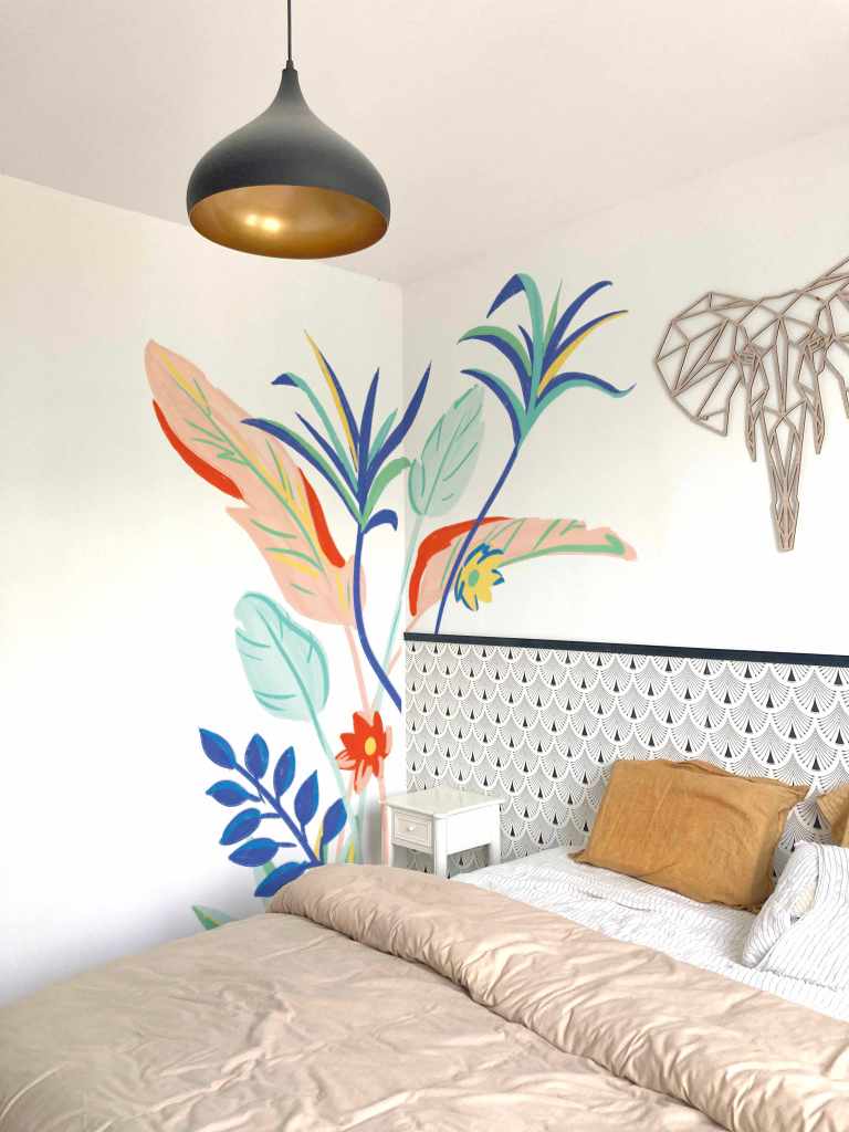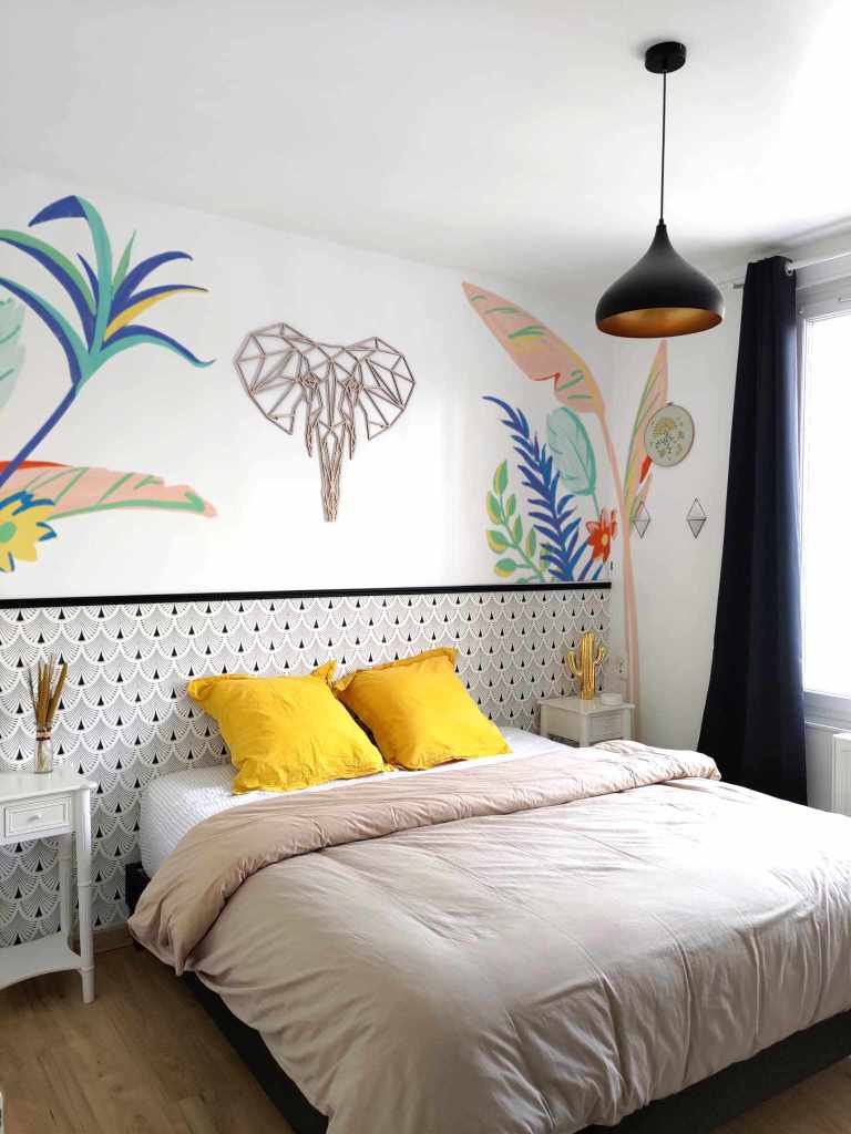 L’objectif : amener couleur, douceur et souplesse sur les murs de cette chambre parentale qui peut être louée tout en cherchant l’harmonie avec l’existant.