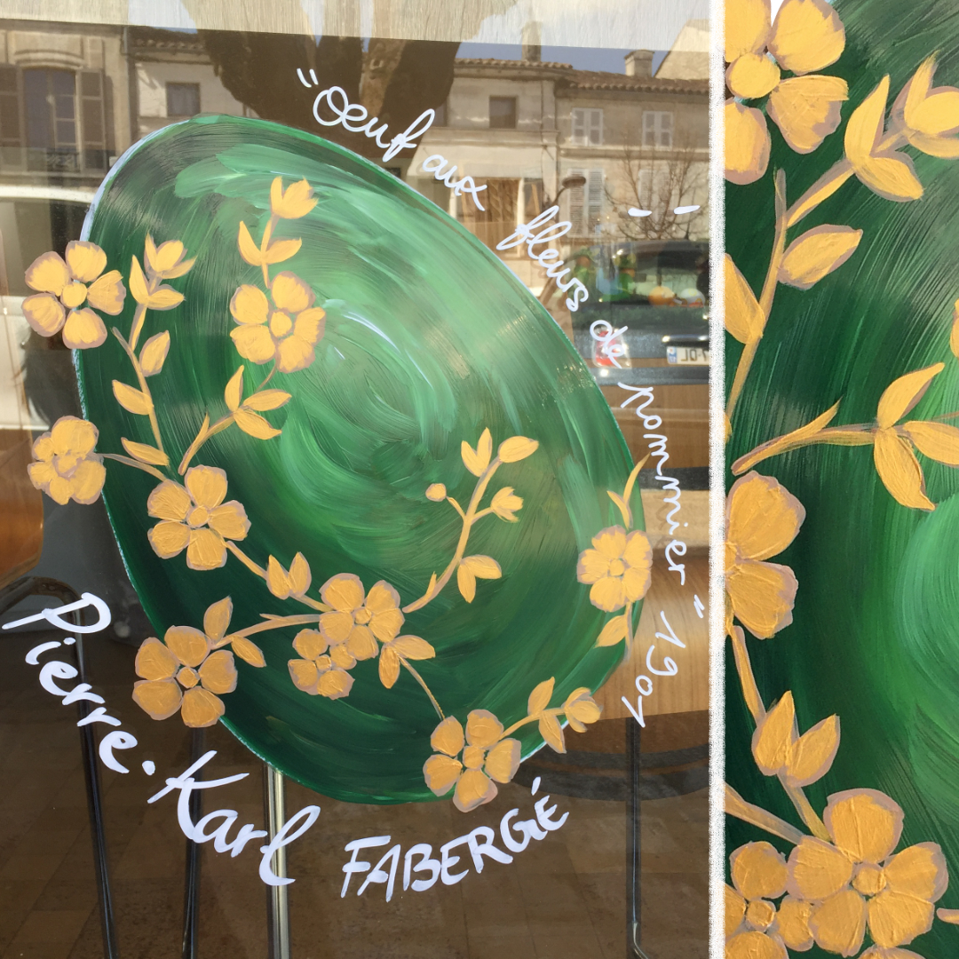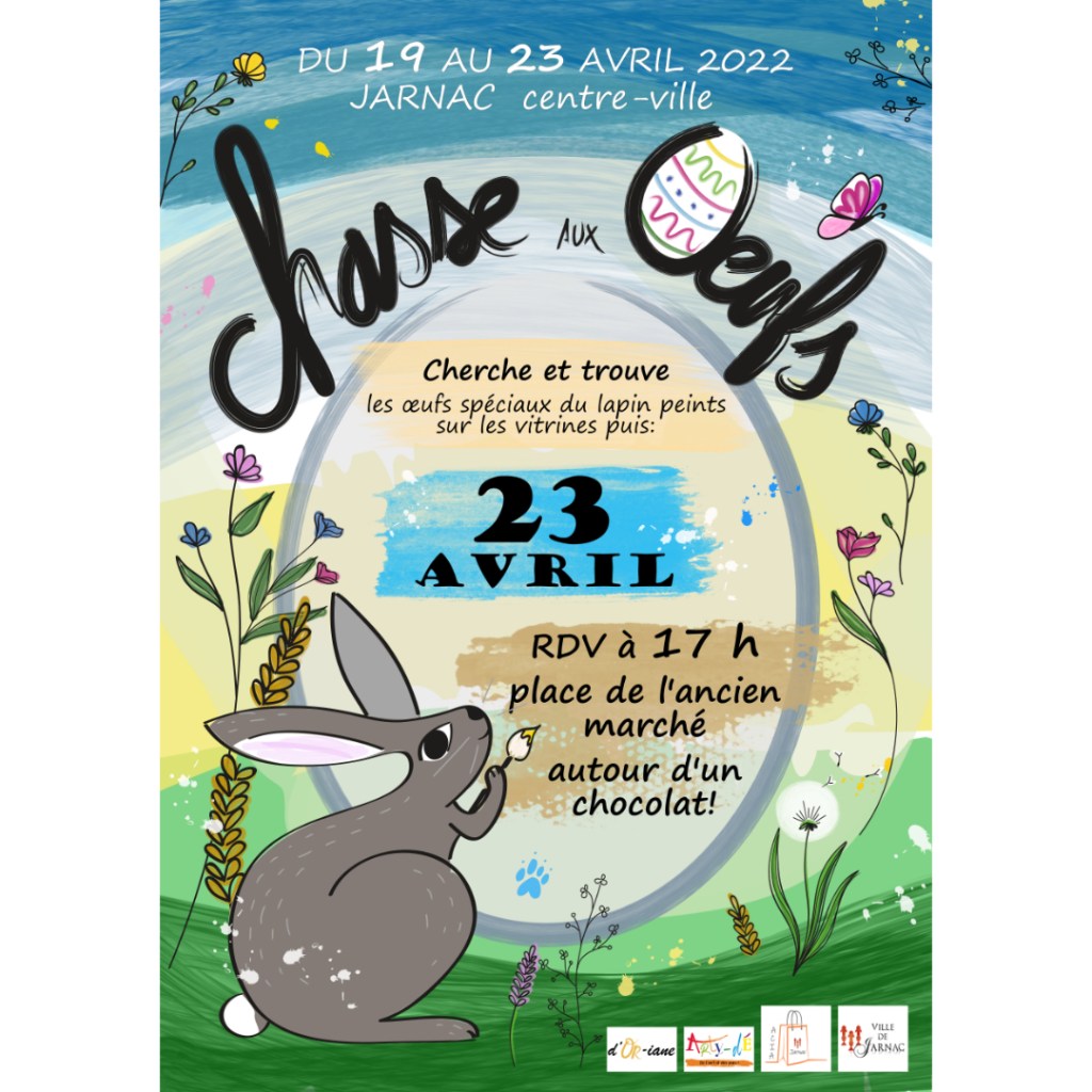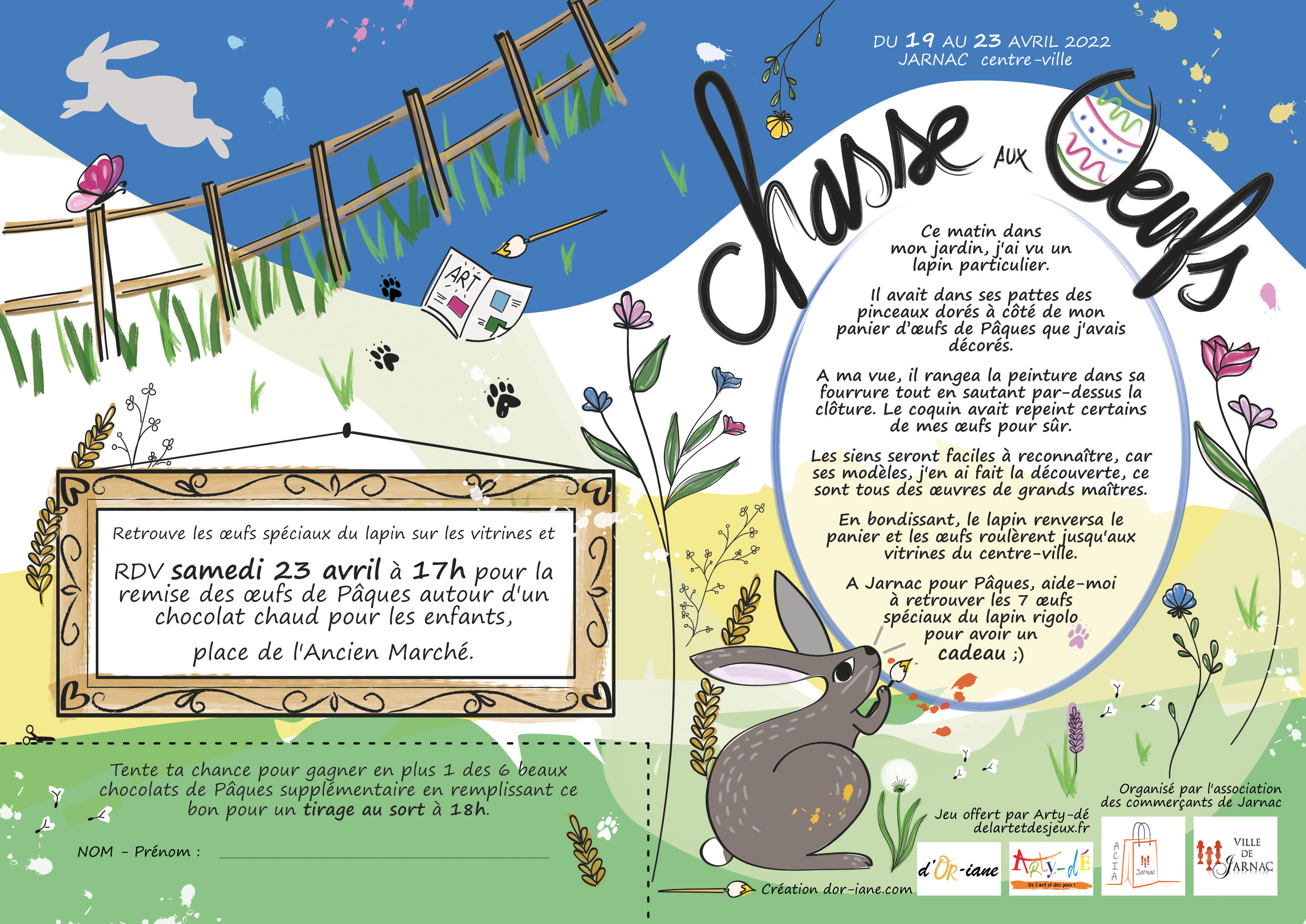 Pâques 2022 à Jarnac (16), une chasse aux œufs artistique a eu lieu sur les vitrines des commerçants du centre-ville. L’animation a été organisée par l’association des commerçants de Jarnac, le concept est signé Arty-dé et la réalisation graphique (flyer à compléter et affiche) ainsi que les peintures sur vitres sont à mon nom.