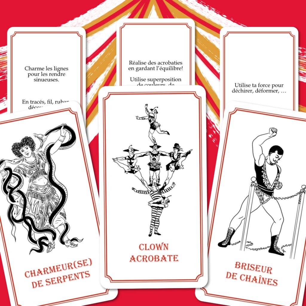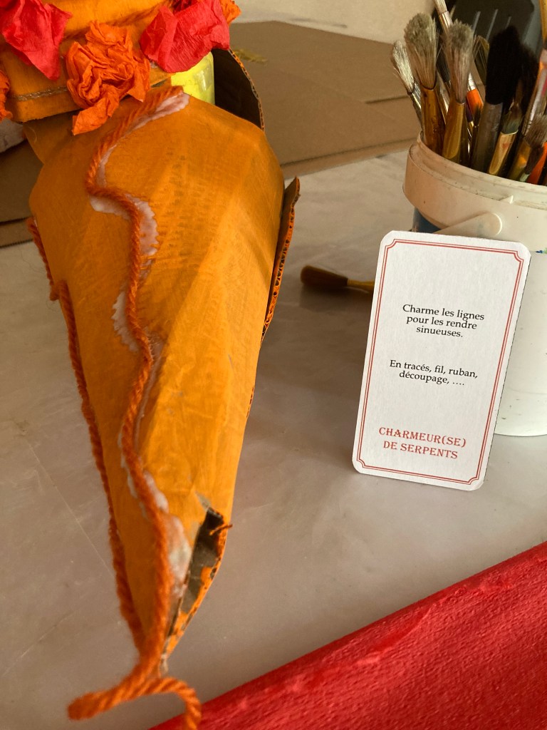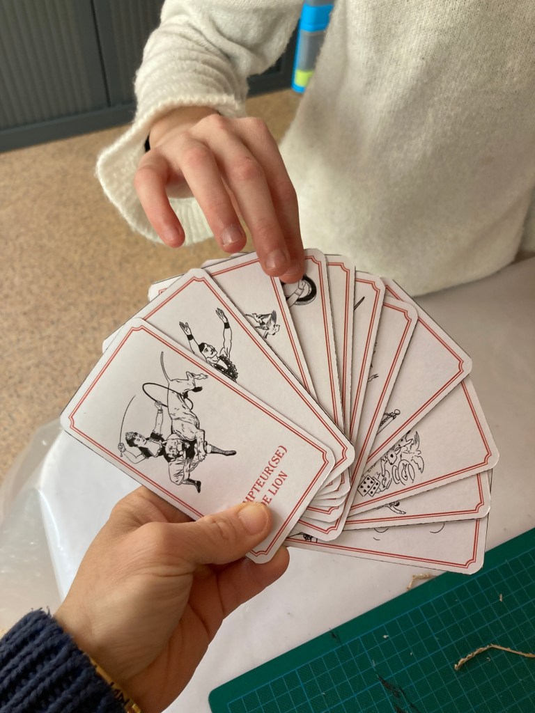 A chaque nouvelle étape de la construction du déguisement, une carte est piochée donnant une contrainte artistique à suivre.