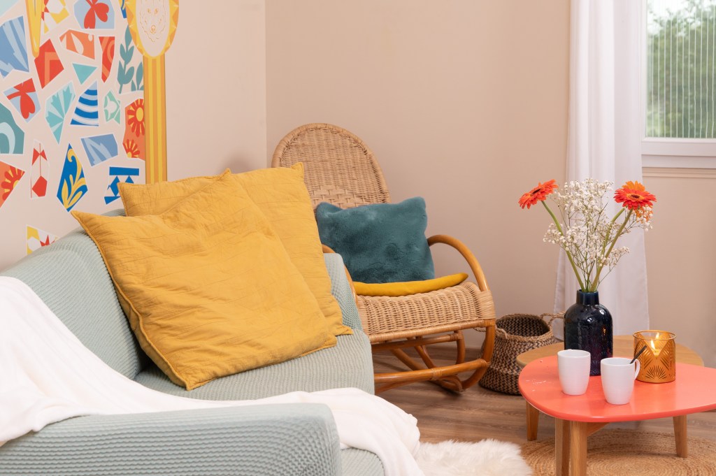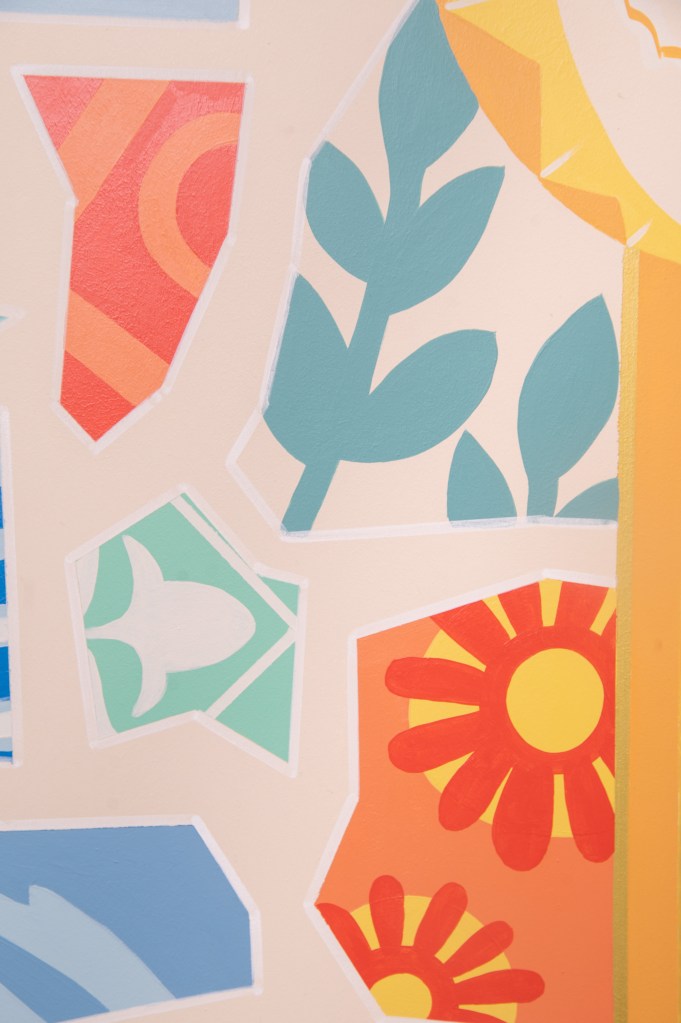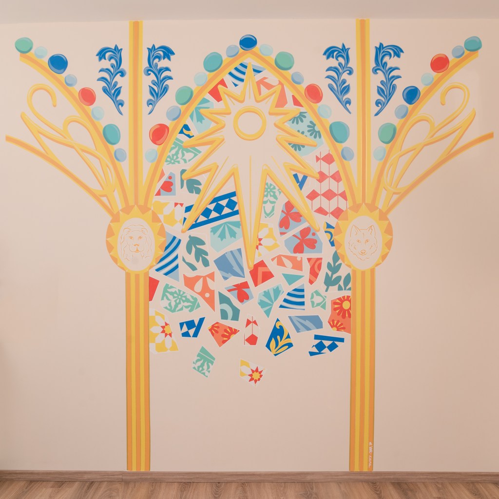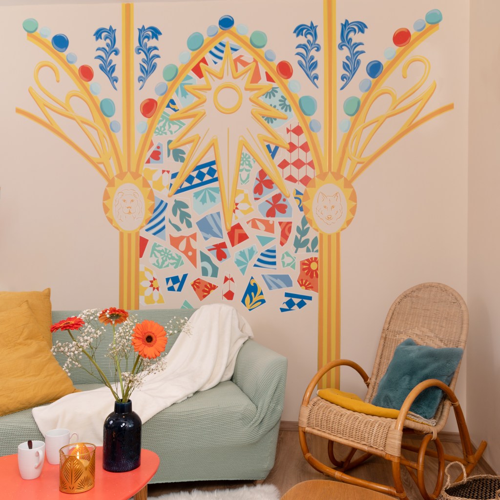 Une belle aventure et un voyage au cœur de Barcelone a pris forme dans un salon. Antoni Gaudi et ses belles œuvres étaient à l’origine de l’inspiration comme les couleurs éclatantes et mosaïques rappelant le Parc Güell ainsi que l’étoile, les arches et piliers à médaillon rappelant la Sagrada Familia. Les symboles des enfants, un lion et un loup s’invitent également sur le mur pour une personnalisation maximum. Merci à mes adorables clients pour avoir pu mener ce beau projet!