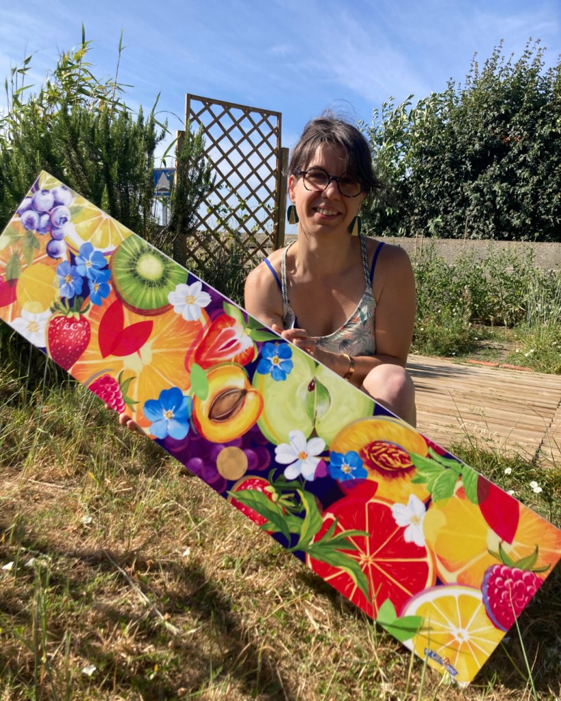 đje suis ravie des tests effectuĂ©s avec Laurent de Vertical Decor avec 2 crĂ©ations graphiques uniques spĂ©cialement conçues pour : Une face fruitĂ©e (coucou les copains nantais, le thĂšme Ă©tait tout trouvĂ© đ) avec de nombreux dĂ©tails, couleurs peps, effets de transparence, pinceaux numĂ©riques effets peinture et aplats et au verso une rĂ©alisation plus linĂ©aire avec couleurs claires.