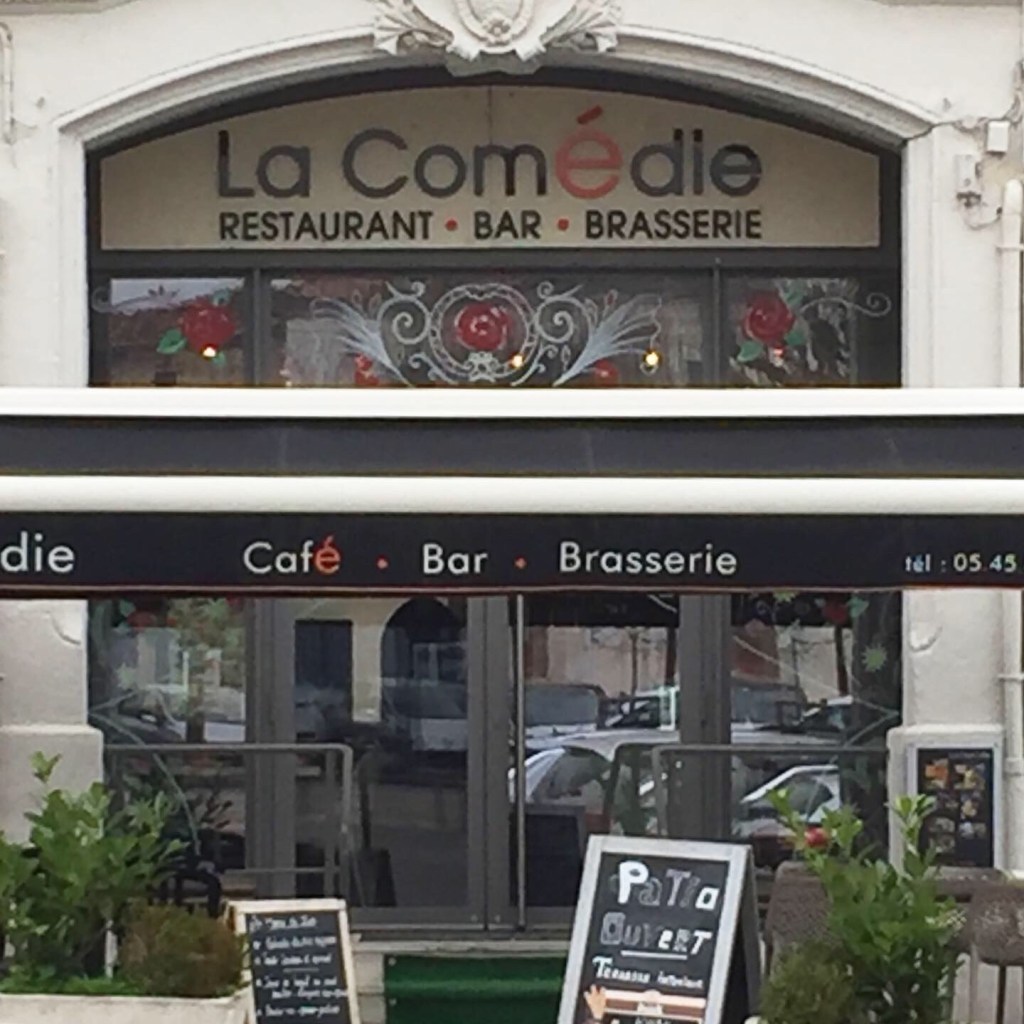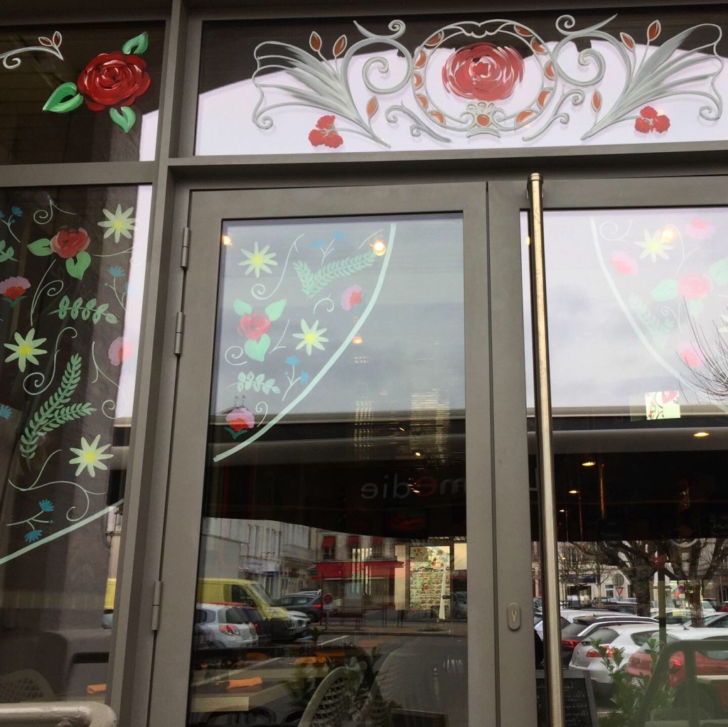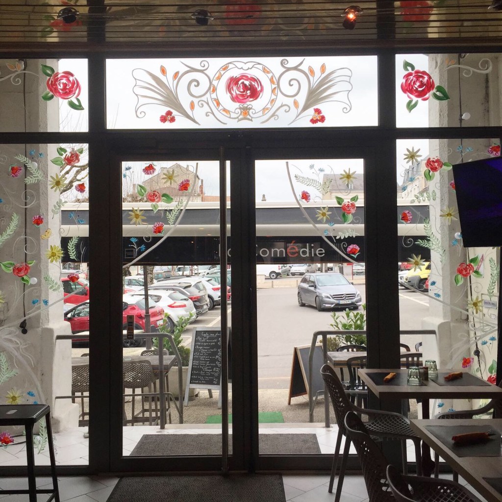 Des rideaux fleuris sont de circonstance pour cet ancien théâtre à l’occasion de l’arrivée du printemps 2022. « La comédie », bar restaurant à Jarnac.