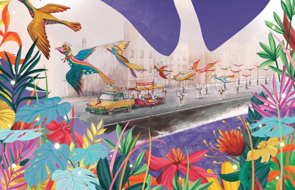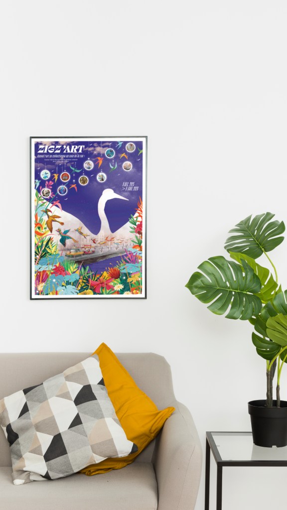J’ai composé l’affiche autour du dessin d’Hervé Vital « La parade des oiseaux » en créant autour un décor exotique et coloré pour réchauffer l’hiver.