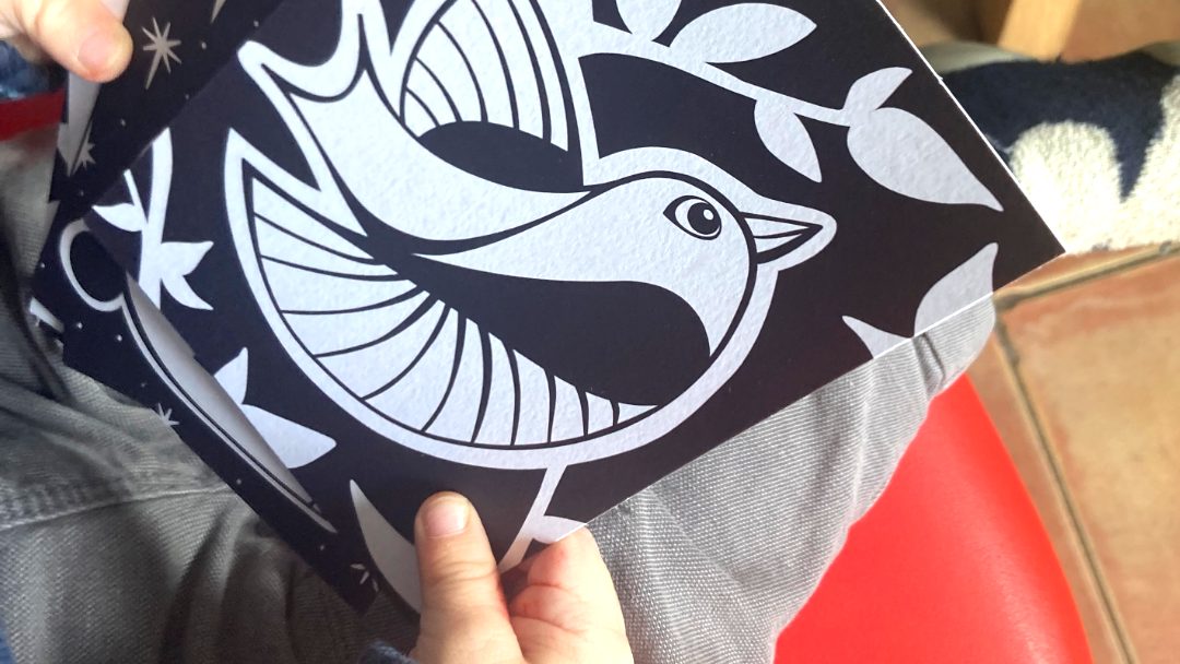Lot de 7 cartes contrastées en papier 300g, 100% recyclé + une planche de stickers éco-responsables imprimés par Stickergreen. Vendu dans un sachet en tissu réutilisable. Plus d’informations ici.